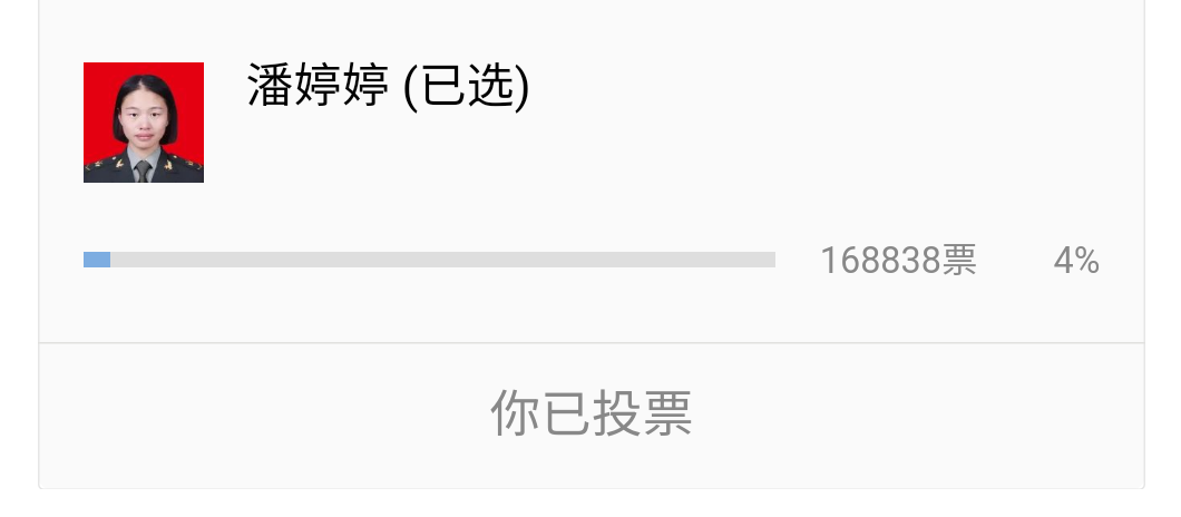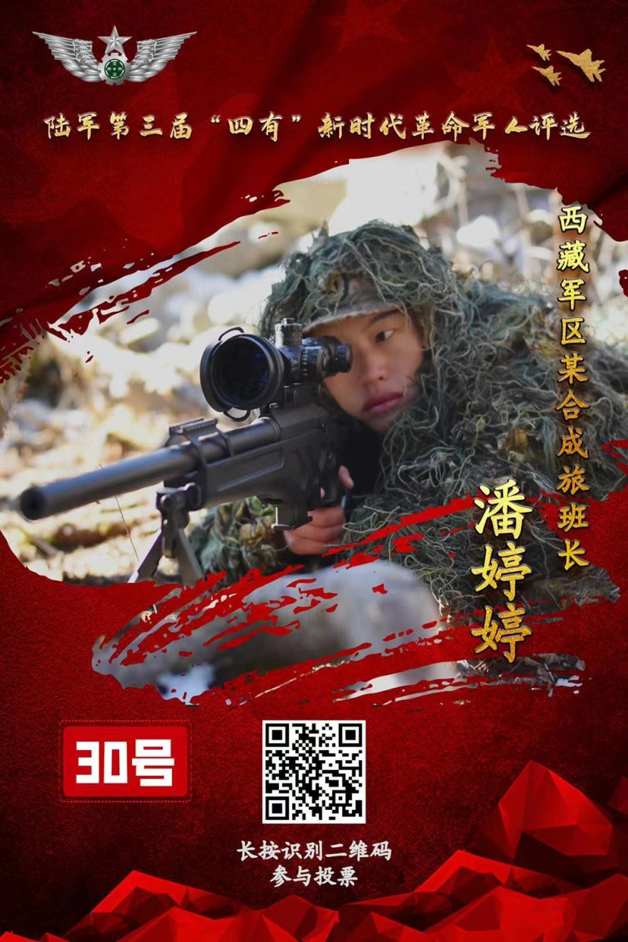 潘婷婷,女,汉族,重庆合川人,1997年7月出生,2016年9月入伍,2018年6月入党,西藏军区某合成旅班长,下士军衔。 她紧贴实战要求苦练打赢本领,勇于挑战自我砥砺血性胆气,历经卫生员、通信兵、狙击手等多个岗位锻炼,精通20余种武器操作,总结出多种枪型在不同条件下的射击方法,参加陆军“狙击精英-2019”考核比武,圆满完成转移阵地射击、昼夜间对固定目标射击等10个课目,夺得个人限制识别射击课目第一、女子组总成绩第一,被表彰为陆军“狙击枪王”,荣立二等功、三等功各1次。 投票方式 识别上方二维码进行投票 为30号,我们优秀的合川老乡投票就可以了 投票截止时间 2020年11月29日8时 希望我们优秀的合川老乡成功入选! 来源:人民陆军 采编:鹤鹤 栏目推荐/投稿热线:13102377767 - END -