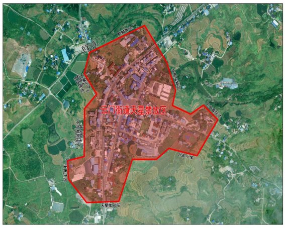 云门街道天星场镇:麒麟食品厂、仲粑店粮站、王大春院子、万家小学、天星加油站、比奥庄园、移民房子(不含移民房子)、石簸污水处理池(不含处理池)、石宝山庄(不含石宝山庄)形成的合围区域。