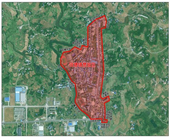 7.钱塘镇场镇,即:钱塘中学、第三人民医院新住院部、旺腾幼儿园、铁泥巴院子、供电所、钱凼街、草航还建房、园凼社区党群服务中心、但堂洪石材加工厂、迎宾桥东、大蟠溪东岸、前进桥东、九洞桥形成的合围区域。