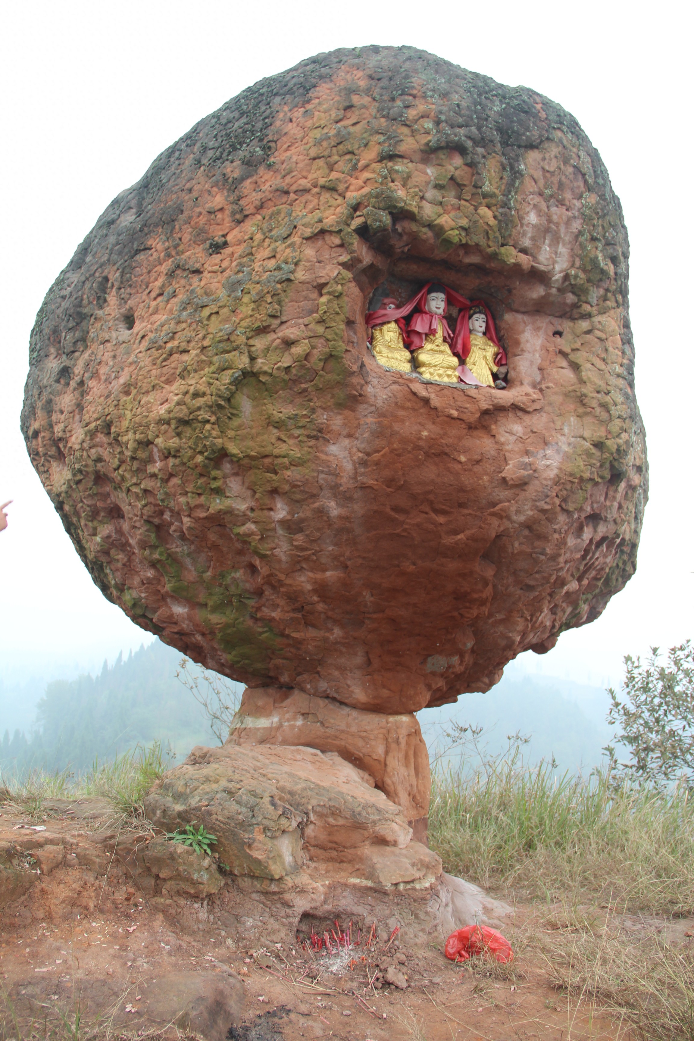 在斗牛石上部,居然还刻有一个小佛龛,小佛龛内供奉着阿弥陀佛、观世音和大势至“西方三圣”。白鹤湖畔斗牛石,万年不倒,神奇依然。